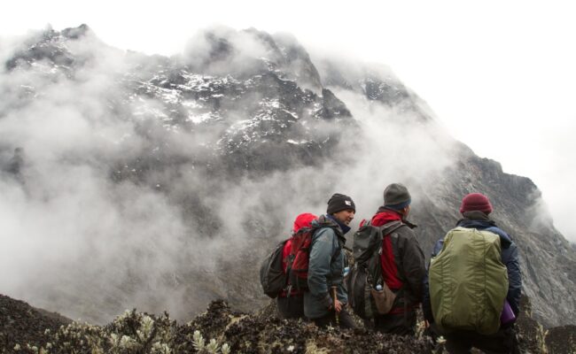 Day 6 of Mt Rwenzori Hiking, awake at 2am and catch an early breakfast before heading off to climb Mt Stanley at 2.30am. This is necessary as the weather has changed a lot and often even during the dryer season the mountain is closed in with heavy clouds and snow falls from 1 pm to 4pm and this happens within a short period of 10 to 15 minutes as the clouds rise up from the extensive Congo rainforests. Additional information: During January and February 2017 clients were closed in and unable to walk during heavy snow storms which previously were not heard of during the dryer season and arrived back at Margherita camp well after dark with one group arriving back at 11pm totally exhausted. There is now a strict turn around time of 10am so if you do not reach the peak before then you must turn around regardless of the disappointment in the interests of safety. Margherita glacier has also suffered with global warming and as the outer edges of the glacier recede the ice is becoming steeper with one section of about 200 meters more than 60% grade.